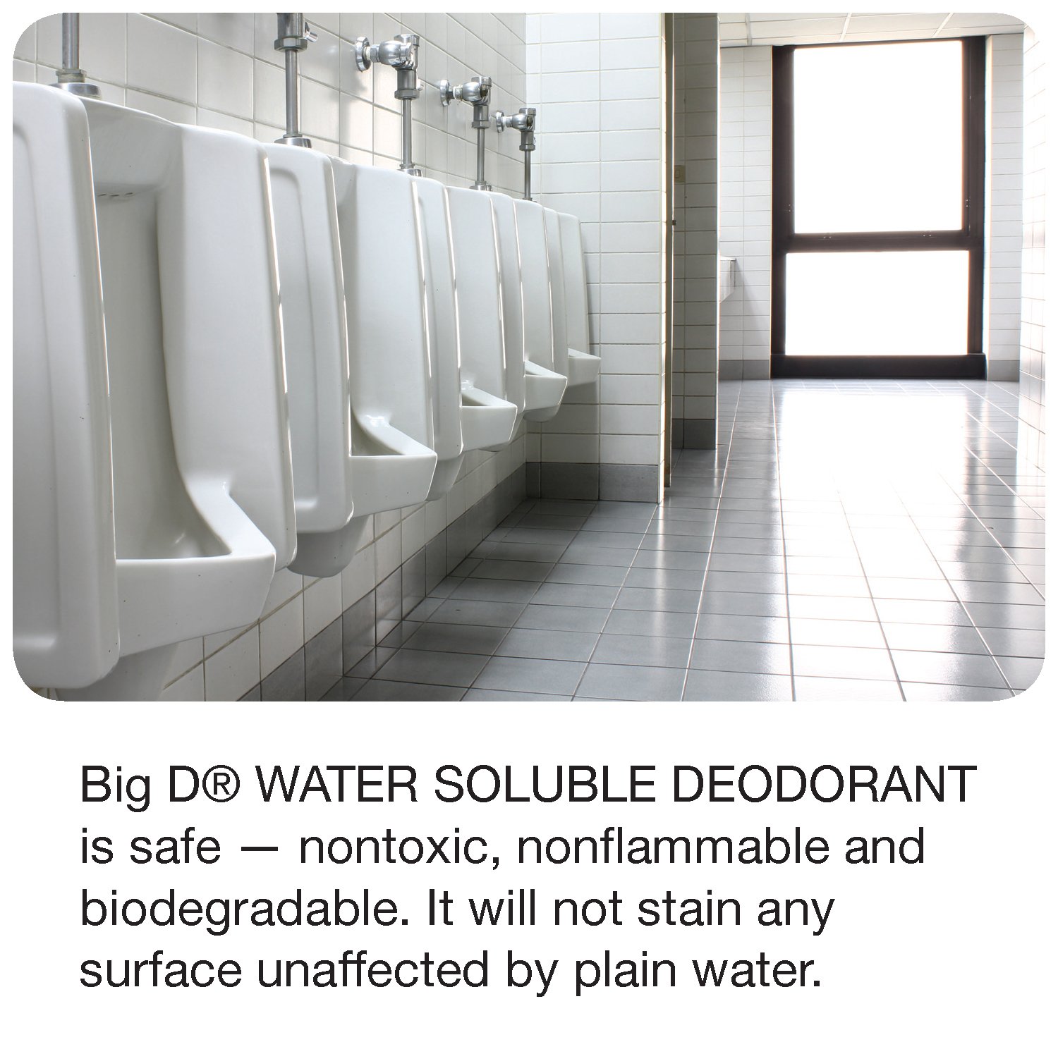 Use Big D WATER SOLUBLE DEODORANT anywhere there's an odor problem or possible odor problem: In mop water, in the washing machine, in the humidifier, in the sick room, around the farm or ranch. WSD is ideal for use with carpet or upholstery. It removes odors associated with pets, food, mustiness, vomit, smoke, etc. Use anywhere any kind of cleaning operation is underway. Big D WSD is concentrated, easy to use and effective. Just a small amount added to water or other cleaning products will destroy odors on contact without changing the properties of the cleaner. Big D deodorants actually eliminate odors, not just mask them. And they are safe– nontoxic, nonflammable, biodegradable, will not stain any material unaffected by plain water. WSD is versatile. Use it for mopping, shampooing, rinsing or in a hand sprayer or fogger.